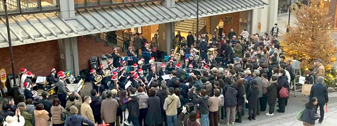演奏はシンボルツリーの点灯と共にクリスマスの定番曲がノリの良い曲調にアレンジされた「Xmas Swingin’コレクション」から始まり、バックナンバーの「クリスマスソング」を演奏しました。またアンコールには私たちの地元岡本で、地域の方々と繋がる貴重な時間を過ごせることへの感謝の気持ちを込めて「ふるさと」を演奏しました。